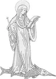 Patroness of farmers and fishermen. A legend says that she crossed the Scheldt River standing on the back of a fish and she is sometimes depicted standing on the back of a fish with a staff in one hand and a bible in the other. She is invoked for problems with the arms and shoulders.